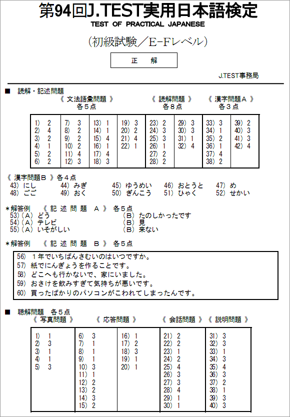 【J.TEST E-F级】第94回考试答案及听力