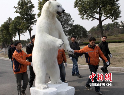 標本になった体長3メートルのホッキョクグマは軽く、2人で動かすことができる 個人が製作した初の野生ホッキョクグマの標本が8日午前、江蘇省常州市の淹城野生動物世界に登場した。この全身真っ白のホッキョクグマの標本は体長が3メートルあり、ぱっくりと口を開け、鋭い歯を見せる様子に見学者たちからは驚嘆の声が漏れた。 [1] [2] 下へ