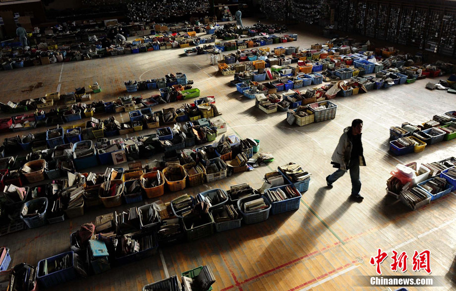 宮城県名取市のある小学校の体育館に設置された被災者の物品を置く場所。被災者が見つけやすいようにするため、近くで見つかったアルバム、卒業証書、かばんなどがここに集められた(4月18日) [1] [2] [3] [4] [5] 下へ ラスタページ