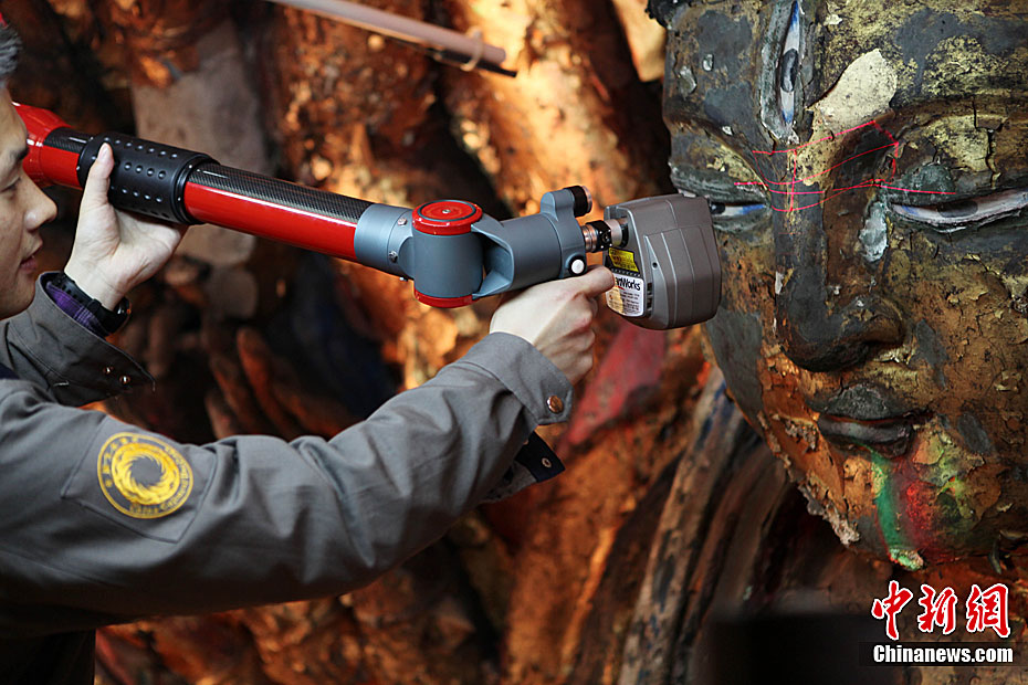 3Dレーザースキャナでスキャンし、千手観音像の表面の金箔の変化を記録する作業員(4月18日) 中国の石質文化財保護の最初のプロジェクトである大足石刻千手観音の補修・保護作業が5月18日、重慶市大足県宝頂山の石刻観光区で正式にスタートした。 [1] [2] [3] [4] [5] 下へ
