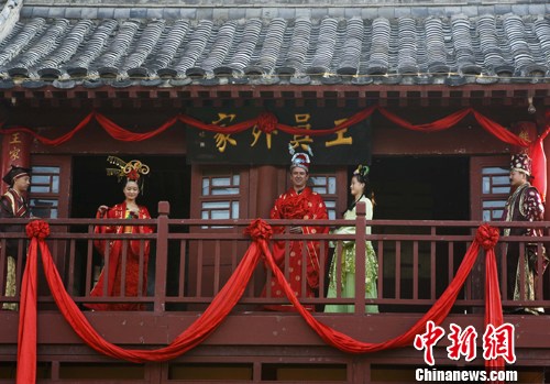 菊花展が開かれている河南省開封で17日、清明上河園では王員外が繍楼で繍球を投げて婿選びをする姿が見られた。王家の娘の美しい容貌に各地から新郎希望の男性が集まり、中には外国人の姿も見られた。最後には外国人が幸運にも繍球をつかみ、王家の娘と結婚するはこびとなった。 「人民網日本語版」 [1] [2] 下へ
