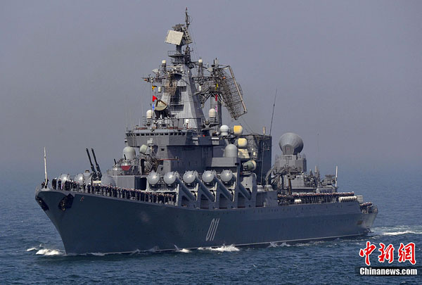 山東省青島沖の黄海で軍事合同演習「海上連合2012」を実施中の中国・ロシア2カ国海軍が26日、合同海上パレードを行った。中国の潜水艦隊、護衛艦隊、ミサイル艇編隊及びロシアの護衛艦隊など、計19隻の艦艇、5つの固定翼航空機編隊に分けられた19機の航空機が海上でパレードを行い、閲兵を受けた。