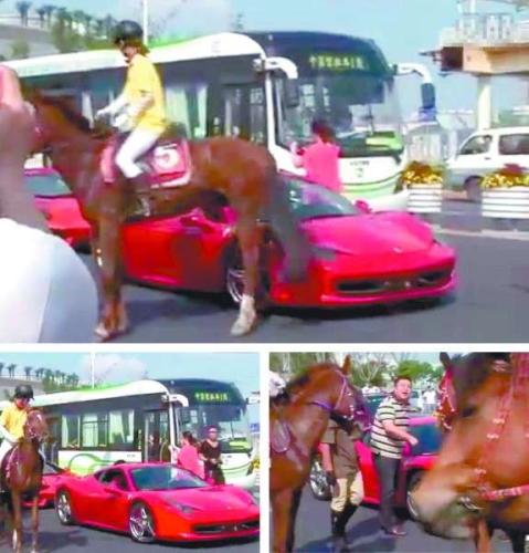 目撃者の陳氏によると、当時は同園で馬10頭が「環境に優しい交通手段」のPRを実施中で、多くの車が停まって眺めていたところ、後方のある車の運転手がクラクションを鳴らし、驚いた馬が後ろのフェラーリを蹴りつけたという。馬に乗っていた女性がすぐに馬をなだめて一歩一歩フェラーリから離れていったが、女性は自嘲気味に「私を売っても弁償できないわ」と話したという。フェラーリの運転手が馬の持ち主と話し合うために車を降りてきたが、寛大な運転手は弁明を聞くとその場を立ち去ったという。