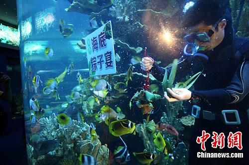 青島市の青島海底世界では20日、手作りの海鮮ちまきやエビちまき、イカちまきなどを円筒形の大型水槽に入れる従業員の姿が見られた。水槽内の色鮮やかな熱帯魚たちがこの特別な端午節のご馳走を味わい、少し早い端午節の訪れを迎えた。「中国新聞網」が伝えた。 「人民網日本語版」