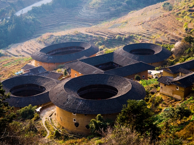 中国福建省南西部の山岳地域にあり、梅花のような美しい建築群、福建土楼。土楼は、客家の人々が、安住のために築き上げた要塞のような城壁に囲まれた建築物である。12世紀から今日まで約900年の歴史を持っている。土楼は通常、長方形か円形をしており、厚い土壁(180センチ以上)と木の骨格から成る。高さは3階か5階、80家族以上が生活している。