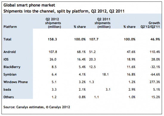 市場調査会社カナリスリサーチがこのほど発表した最新の報告によると、2012年第2四半期(4-6月)、世界の多機能携帯電話(スマートフォン)出荷台数は1億5800万台に上り、中国が占める割合が27%と他国を上回った。