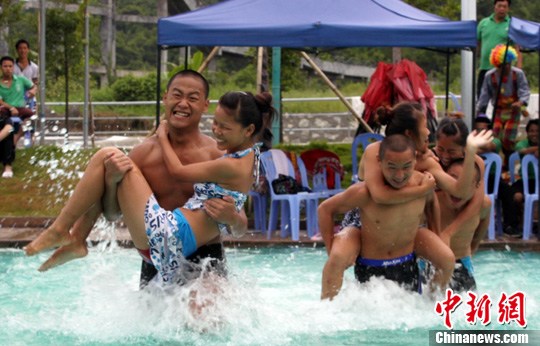 広東省高明九寨水城では12日、水上で妻や恋人を運ぶ奇抜で面白い競技が行われ、夫婦やカップル20組が参加した。スタートの号令と共に、妻や恋人を背負ったり抱えたりした男性がプールの中を疾走し、パートナーを水に落とさずに最も早く往復した人が勝者となった。「中国新聞網」が伝えた。