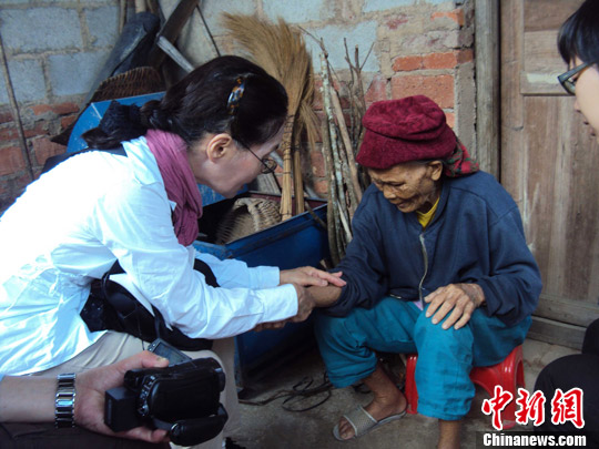 保亭黎族苗族自治県南林郷羅葵村で、林亜金(86)さんの手を握る金静美さん。 |