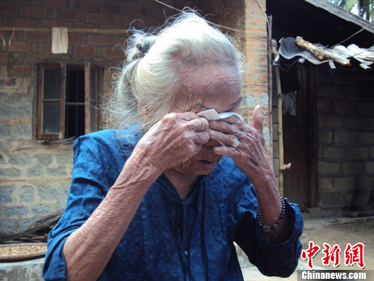「生きている間に日本政府からの謝罪がなければ、死んでも死に切れない」と涙を流しながら訴える陳亜扁(87)さん=海南島陵水県本号鎮祖関村。 |