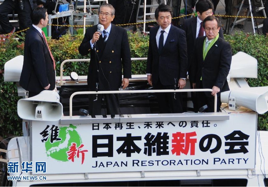 12月4日,在日本大阪的梅田街头,“日本维新会”党首石原慎太郎(左二)发表演讲,为该党在众议院选举中造势。当日,为期12天的日本国会众议院竞选活动正式拉开序幕。从上午8时半起,日本中央选举管理委员会开始受理各政党的比例代表选区候选人名单,各都道府县选举管理委员会受理小选区候选人申请。