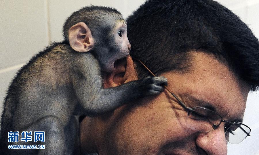 5月22日、ブラジルのリオデジャネイロ、生後2ヶ月の小猿が自分の獣医でパートナーであるアレキサンダーさんとひそひそ話をするところ。