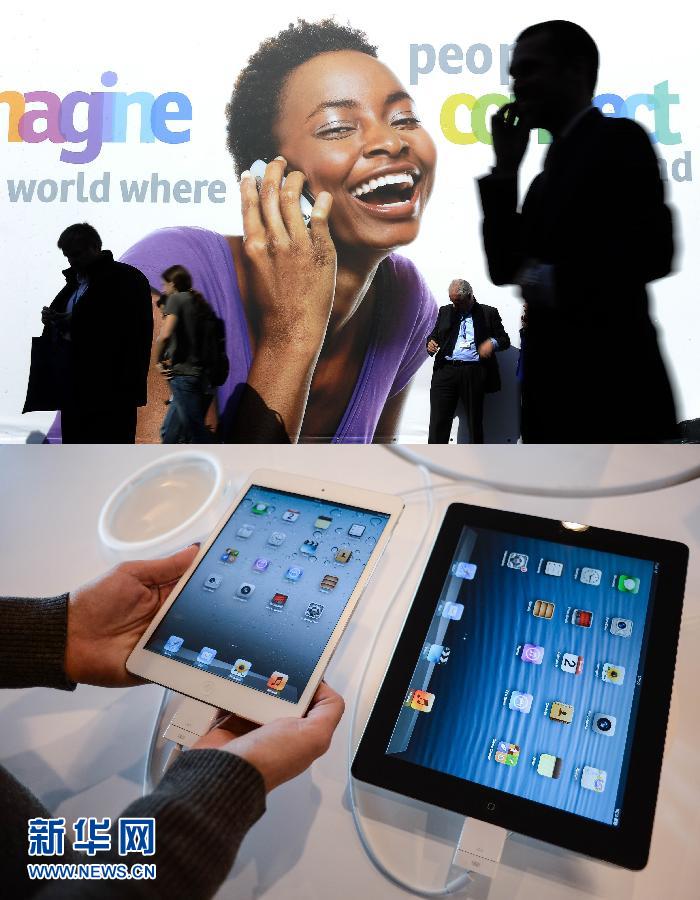 2月27日、スペインのバルセロナで移動通信世界大会が開催中、巨大ポスターの前でスマートフォンを使う人々。(上)11月2日、イタリア・ローマのアップルストアで新発売のmini iPadとiPadを比較する客(下)。