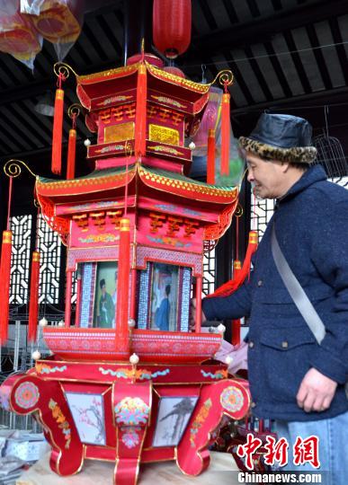 国家級非物質(無形)文化遺産蘇州灯彩の伝承者である汪篠文氏は4カ月以上かけて五尺の宮廷灯篭である「万眼羅灯」を制作した。写真は「万眼羅灯」の構造や特徴を説明する汪篠文氏。 [1] [2] 下へ