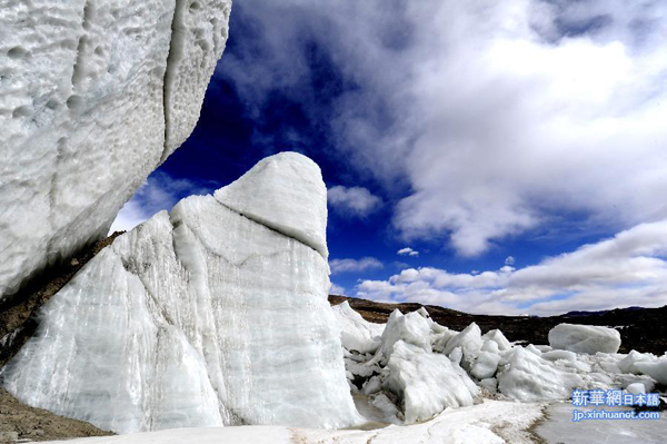西蔵(チベット)自治区羌塘北西部に位置する双湖特別区の東北90キロにある普若崗日氷河は国家級羌塘保護区の主要なエリアに属し、那曲鎮から560キロメートル離れた西蔵の有名な観光地の一つだ。普若崗日氷河は南極、北極を除いた世界第3の氷河で、氷原面積は422平方キロメートル、表面は滑らかで、北西から東南へと線状に分布している。氷原から周辺の山や谷に50本以上の様々な長さの氷が伸び、最高地点の海抜は6400メートル、最低地点の海抜は5350メートルだ。同風景区では氷河、湖沼、砂漠が一体となった風景を見ることができる。氷原周辺には多くの湖沼があり、氷河からの融水が流れ込んでいる。気候の影響を受けて最近は氷河の融水が目立ち、様々な形態の氷の塔が見られ、壮観な景色が広がっている。 撮影:新華社記者 覚果