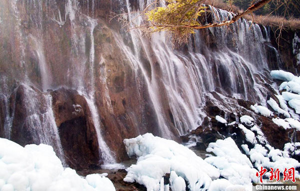 冬真っ只中の四川省の有名な観光地、九寨溝では4日、晴天の下で雪が溶け始め、春の気配が感じられた。国内外から訪れた多くの観光客が独特の春の美しい景色を楽しんだ。写真は多くの観光客を魅了する九寨溝。