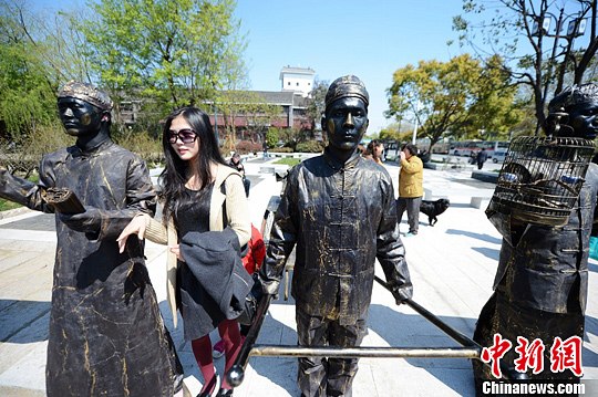 揚州の街中では7日、生きた「銅の彫像」のパフォーマンスアートが訪れた市民の注目を集めた。体に色を塗った人が銅の彫像に扮し、長い辮髪と長袍馬褂姿で、扇やちょうちんなどを手に通行人との記念撮影に応じて、現場は歓声に包まれた。パフォーマンスアートは8日に開幕する2013年中国揚州万花会のイベントの一環だ。中国新聞網が伝えた。