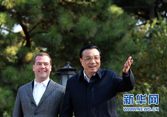 秋の金色の陽光の下、両首相は木々の照り映える石道を肩を並べて歩きながら、国事や友情を語り合った。メドベージェフ首相は度々写真を撮影した。御苑の石門前で李総理とメドベージェフ首相は握手をして別れを告げ、来年モスクワで開かれる第19回中露定期首相会談での再会を約束した。