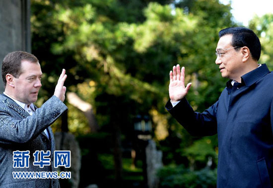 李克強総理とメドベージェフ首相が散歩、名残を惜しむ