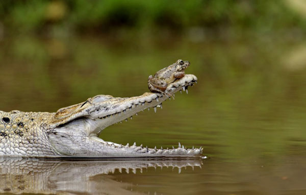 英纸「デイリーメール」3月5日の報道によると、近日、39歳のカメラマンFahmi Bhsさんがインドネシアですごい写真を撮影した。あるカエルは食べられないために、ワニの鼻先に座っていた。ワニはただカエルを見て、捕まえることができなかった。