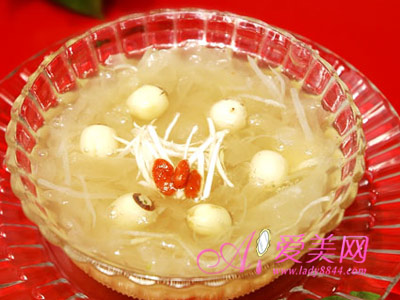 作り方:蓮の実30グラム(芯は取らない)、クチナシの実15グラム(薄い布で包む)、適量の氷砂糖を水で煮て、蓮の実を食べ、スープを飲む。