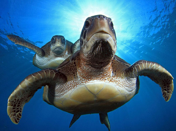 心温まる アオウミガメが仲良く海を泳ぐ写真