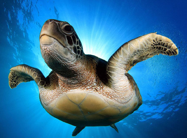 心温まる アオウミガメが仲良く海を泳ぐ写真