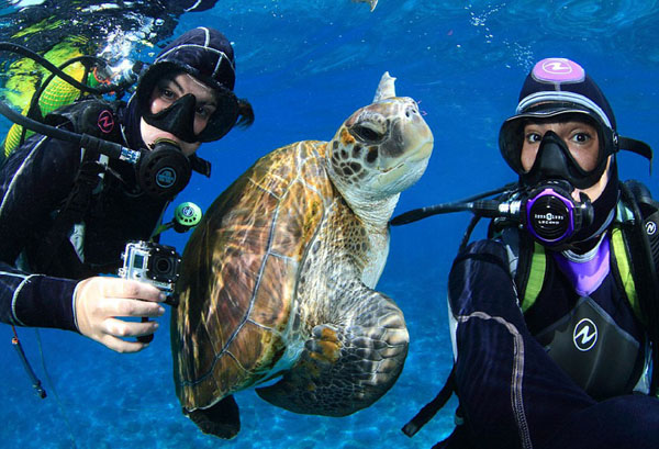 心温まる アオウミガメが仲良く海を泳ぐ写真