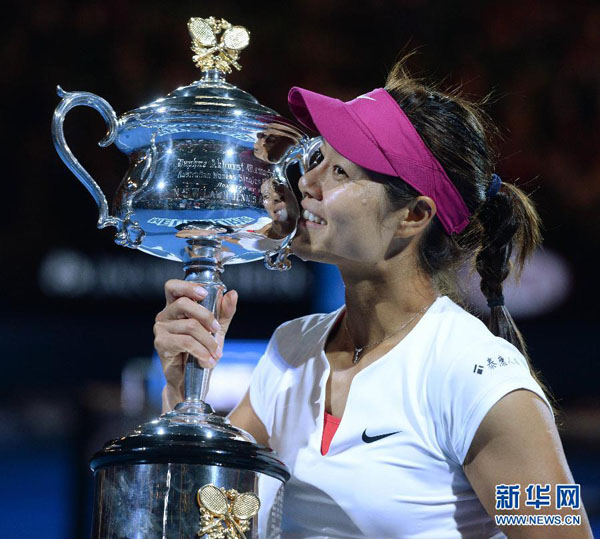 2014年1月15日、2014年全豪オープンの表彰式でトロフィーにキスする李娜選手