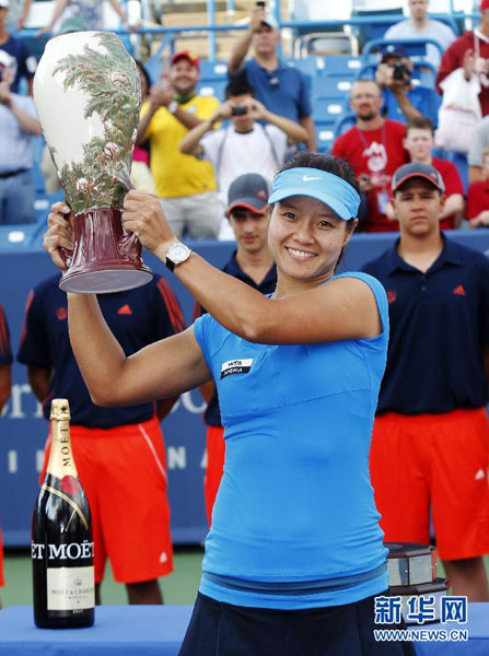 2012年8月19日、2012年WTAシンシナティ・マスターズの女子シングルス表彰式でトロフィーを持って写真を撮る李娜選手