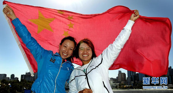 2010年1月27日、メルボルンで国旗を持って写真を撮る李娜選手(右)と鄭潔選手