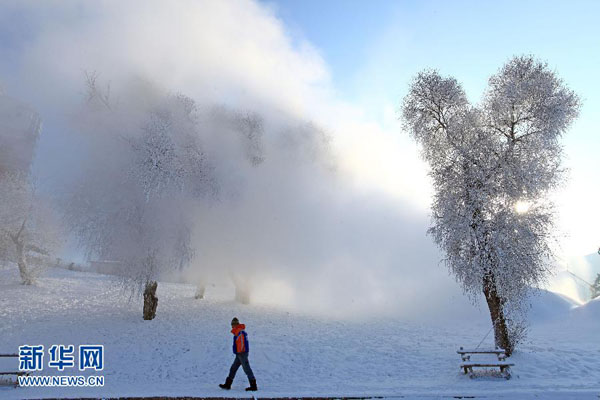 写真は9日、吉林省吉林市松花江の河畔で樹氷を見る観光客。吉林市松花江の河畔では同日、樹氷が発生し、幻想的で美しい風景が多くの人をひきつけた。新華網が伝えた。