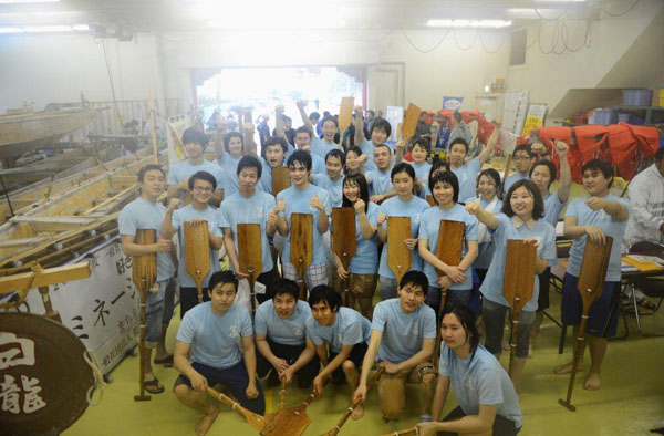 気勢を上げるぺーロン競漕のチーム(相生市ペーロン城にて)