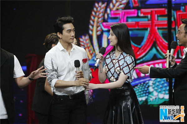 韓国の俳優、ソン・スンホンと中国の女優、劉亦菲(リュウ・イーフェイ)が湖南省長沙市で、中韓合作映画「第三種愛情」PRのため湖南衛星テレビのトーク番組「天天向上」の録画を行なった。この2人が熱愛が明らかになって以来初めて、テレビに登場した。
