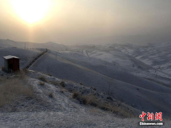 祁連山の麓に広がる雪の草原、一面に広がる壮大な景色