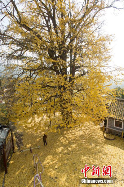 貴州の古い銀杏の木 冬を迎えるも秋色に輝く