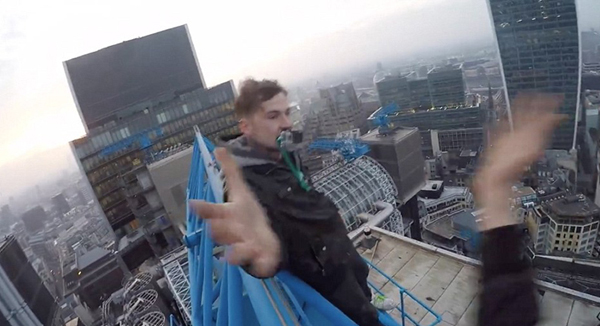 英男性がビルに登る ロンドンを撮影