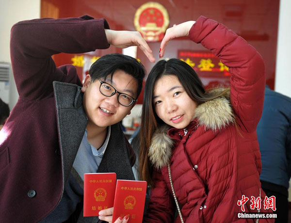 「バレンタインデー」の2月14日、河北省石家荘のある民政局結婚登記所には多くのカップルが入籍手続きに集まり、独身生活に別れを告げた。中国新聞網が伝えた。