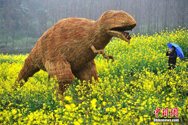3月22日、重慶市沙坪ハ区中梁鎮にある広大な菜の花畑に、ワラで作られた大きな恐竜、ゾウ、牛などが登場し、多くの観光客を引きつけている。